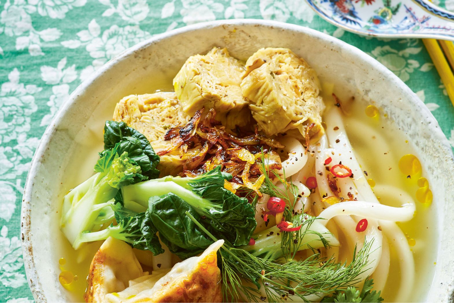 - Garnish the bowls with dill or coriander (or both), black pepper, additional toppings as you desire and your choice of greens. (If using pak choi, Chinese broccoli leaves or mustard leaves, you need to blanch these first.) Bring the broth to a boil and ladle over the noodles. Serve immediately with lime wedges.