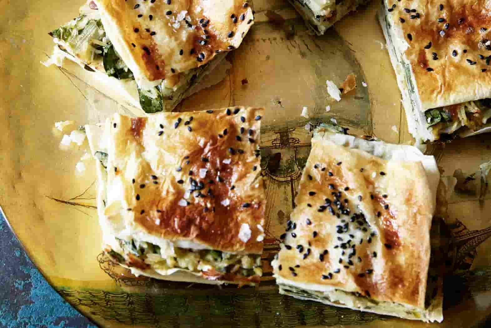 "A deeply savoury börek filled with rice, sultanas, pine nuts and chard. It isbaked as a large pie rather than as small pastries, making it ideal for a lunchtime