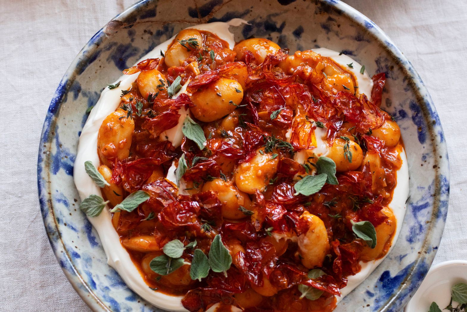 - Put the remaining 75ml of oil into a medium saucepan and place on a medium heat. Add the onion, garlic, oregano, thyme, fennel seeds and bay leaf and cook for 10–12 minutes, until the onion has softened but has not taken on too much colour. Add the wine, simmer for 2 minutes to reduce, then add the paprika. Cook for another minute, then add the reserved tomato flesh, along with 1 teaspoon of salt. Simmer gently for about 15 minutes, stirring often so that the tomatoes break down. Add the beans and a good grind of pepper and stir to combine. Cook for a couple of minutes, just to warm through, then remove from the heat. Spread the yoghurt over a serving plate and then pile the beans on top. Crumble over the dried tomato skins, finish with a sprinkling of thyme leaves and serve.