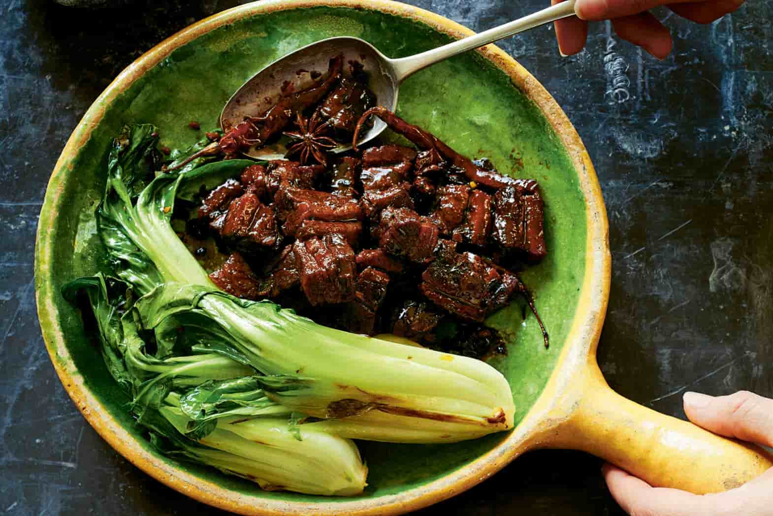 - Heat a wok over a medium heat, add the rapeseed or groundnut oil and give the oil a swirl. Add the pork pieces and brown for 2 minutes, then add the ginger, rice wine or dry sherry, the star anise, Sichuan peppercorns, dried chillies, chicken stock, dark soy sauce, brown sugar and salt. Cover with a tight-fitting lid and cook over a medium heat for 45 minutes, until the liquid has reduced and thickened slightly and is a glossy reddish-brown colour.