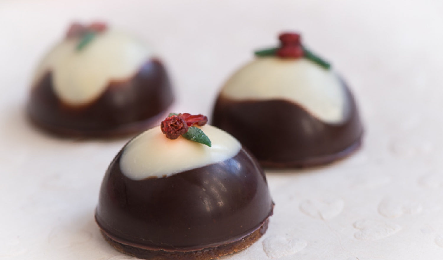 - Pipe into the chocolate half spheres on top of the chocolate leaving a little space at the top for the biscuit and the Christmas pudding layer.