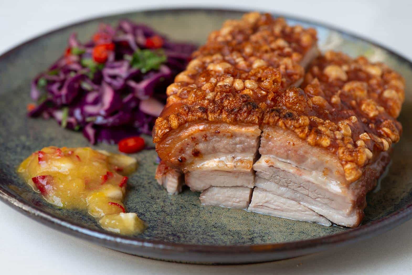 - Preheat the grill to hot and place the pork belly, still in its roasting tin, under the heat until the skin has puffed up into crisp crackling – keep an eye on it, as it can burn very quickly.