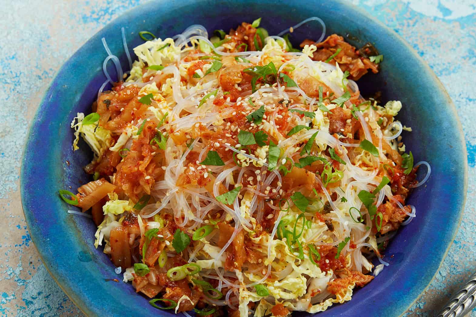 Bean thread noodles – made from mung bean starch – are also called cellophane noodles, a name reflecting their transparent appearance once soaked. The charm of bean thread noodles is that they retain a firm texture even after soaking, which makes them a popular ingredient for soups and hotpots. Here, they are mixed with crunchy Chinese cabbage and a spicy kimchi dressing. Kimchi – regarded as Korea’s national dish – is a fermented vegetable condiment, often made from Chinese cabbage, which is increasingly available in the UK.