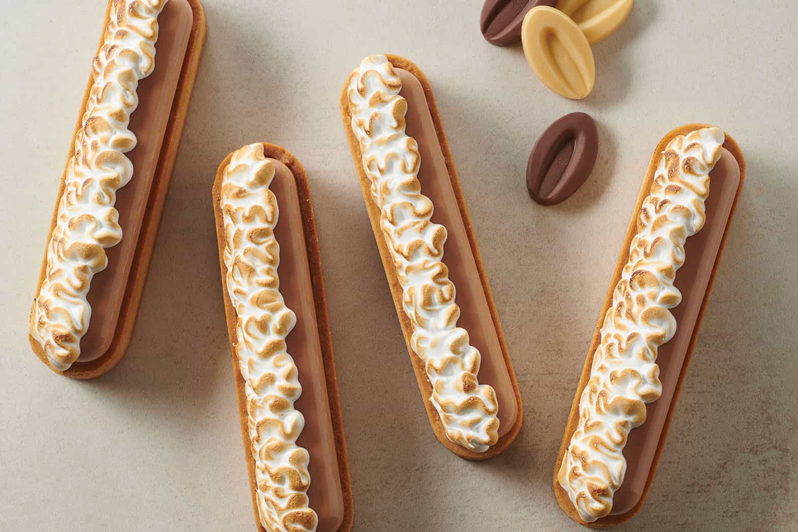 Valrhona’s passion fruit couverture give these meringue tarts an intense burst of fruity flavour that balances against the creamy milk chocolate mousse. An Italian meringue topping gives an elegant finish to these individual tarts.