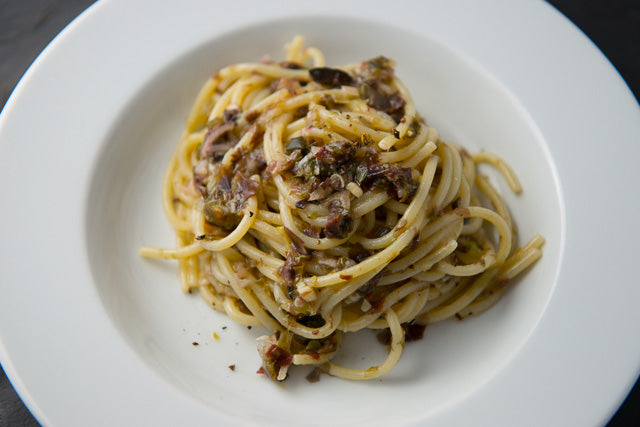 This seaweed tapenade recipe is a great alternative to a more traditional salsa verde. It's a little less sharp, but has more depth - you can add more or less lemon juice depending on what mood you're in. We use a variety of different seaweeds for both look and texture: sea spaghetti and irish moss for crunch, dulse for purple hues, and nori and sea lettuce for smoothness. Because the seaweed is stored dry, the tapenade is the perfect store-cupboard standby.