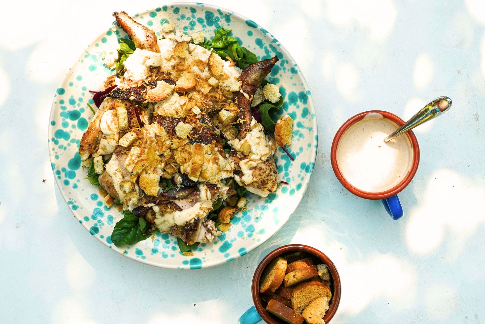 - Arrange over the lettuce and drizzle liberally with the white BBQ sauce and put more on the side for extra dipping. Scatter the salad with croutons and crispy onions and for extra decadence add little dabs here and there of fresh honey comb to find amongst the leaves like little pools of golden sweet surprise.