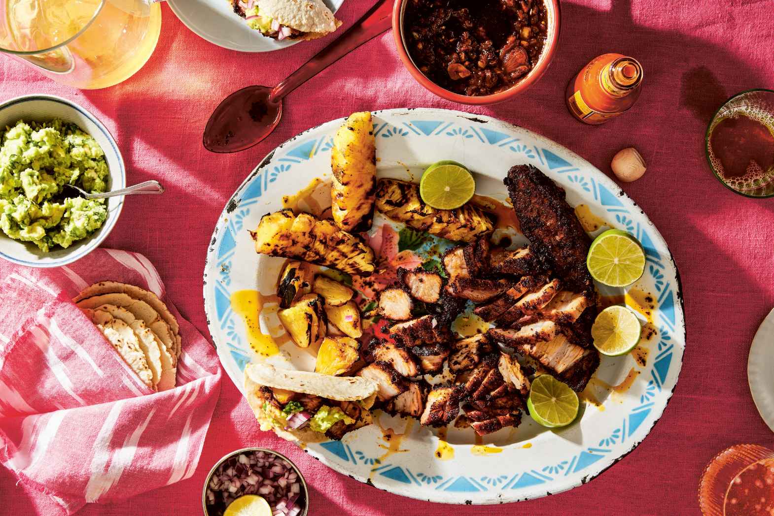 The rub for these tacos is based on the classic dish al pastor, which is traditionally made with pork and cooked on a kebab spit called a tromp, a cooking method that was introduced to Mexico by Lebanese immigrants. I’ve developed a version using pork belly strips, which cook very quickly and have a perfect fat to meat ratio in every bite. The key is to cook them away from the coals so that they become tender but the fat doesn’t drip, causing massive flare-ups.