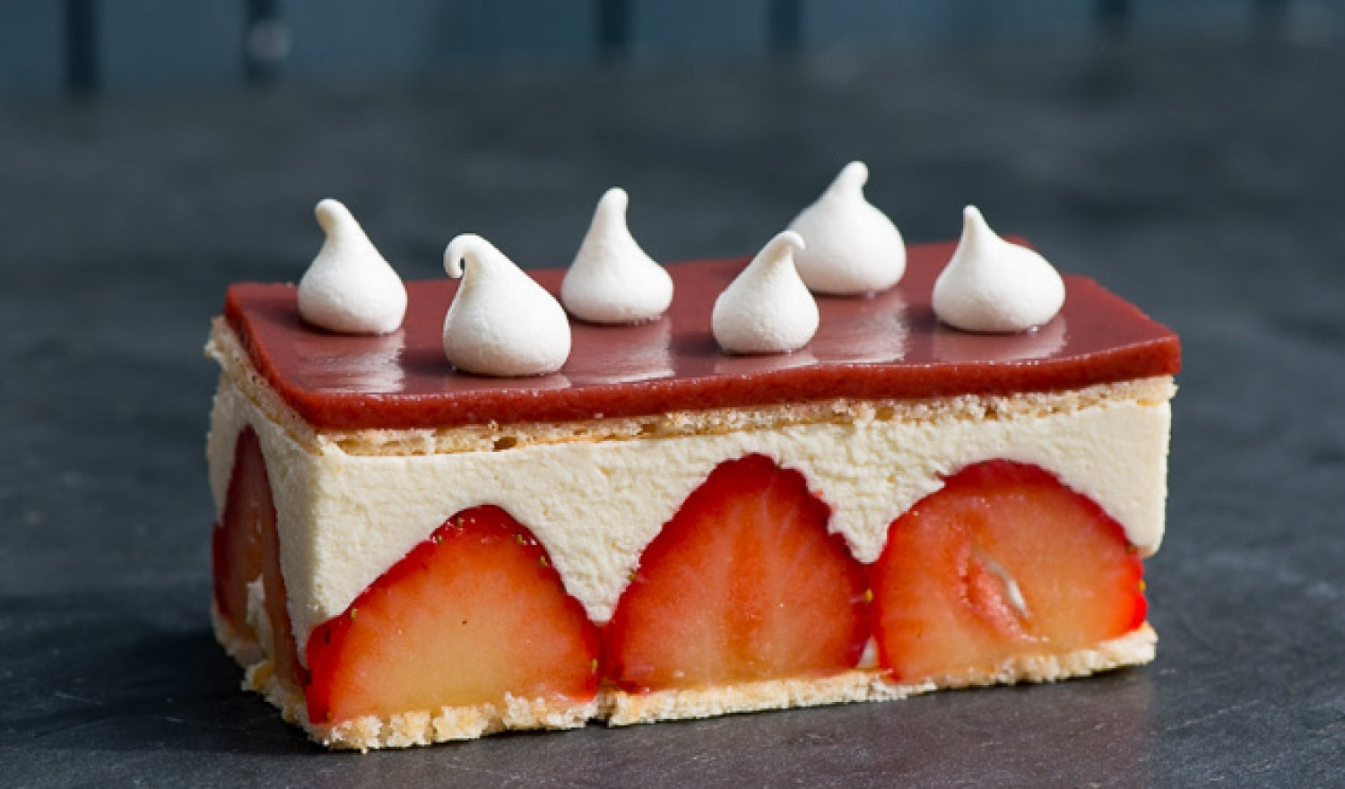 Our twist on the classic fraisier includes a layer of strawberry jelly and a handful of mini meringue drops makes this novel strawberry frasier recipe. The jelly is made from strawberry puree which adds an intense hit of fruit flavour alongside the fresh burst of fresh strawberries. Mini meringues add a vibrant colour contrast against the strawberry jelly and bring texture with their light crispiness.