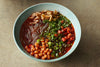 - Divide the hot stock between the bowls and mix with the sauce. Add the noodles, then sprinkle over the spring onions, mustard stems, coriander, soybeans, and peanuts and serve.
