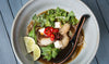 - Divide into bowls and serve alongside the sliced red chilli, lime wedges, mint, coriander and cubes of tofu to garnish.