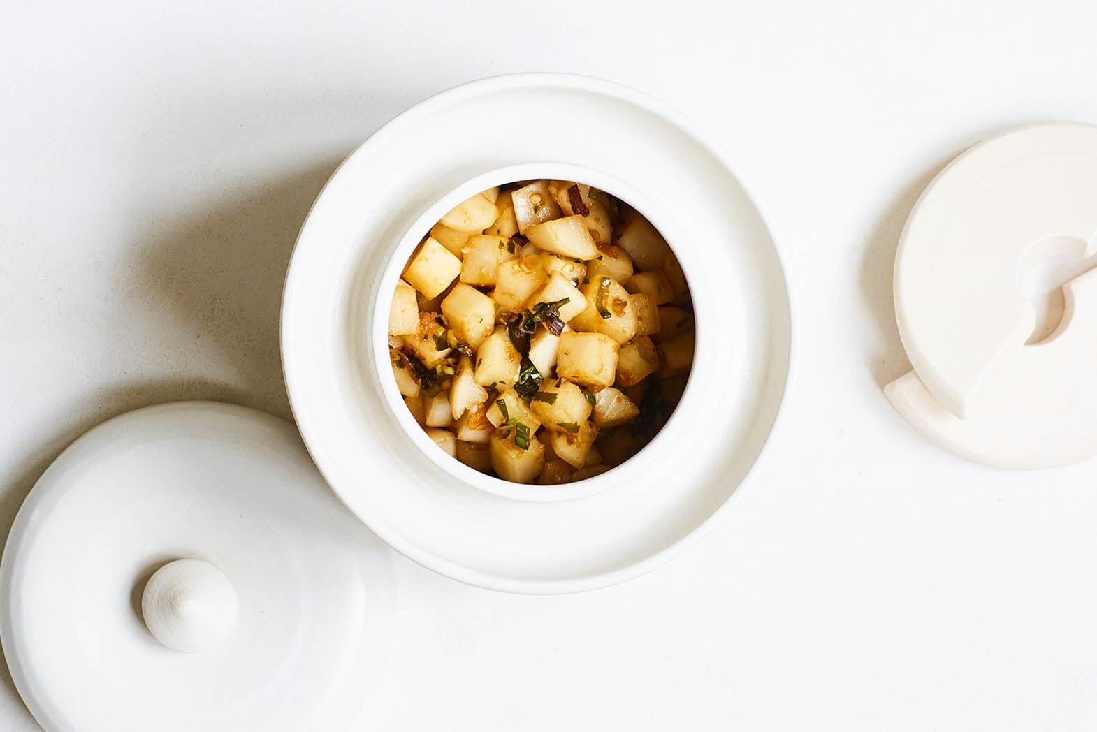 - Toss the prepared daikon with the salt and leave to drain in a colander overnight. The next day give it a quick squeeze and mix with the rest of the ingredients. Pack into a 2 litre preserving pot or jar, pressing down to ensure it is covered with liquid. Cover with a piece of baking parchment, weigh down and seal the jar.