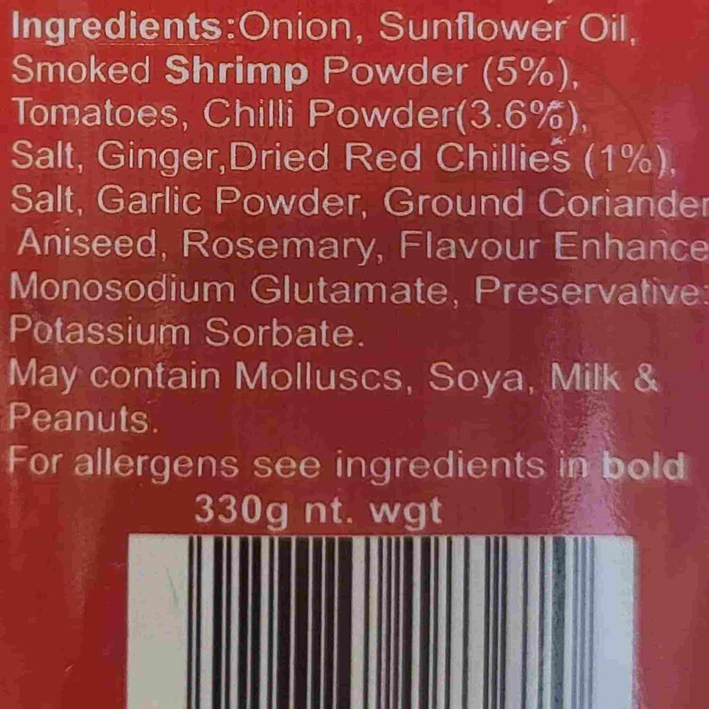 Product formulations and details may change. For the latest ingredients and allergen information always check product packaging prior to consumption. Ingredients: Onion, Sunflower Oil, Smoked Shrimps Powder (Crustaceans) (5%), Chilli Powder (3.6%), Tomatoes, Ginger, Tomatoes, Dried Red Chillies (1%), Salt, Garlic Powder, Ground Coriander and Aniseed, Rosemary, Monosodium Glutamate (E621), Potassium Sorbate (E202)