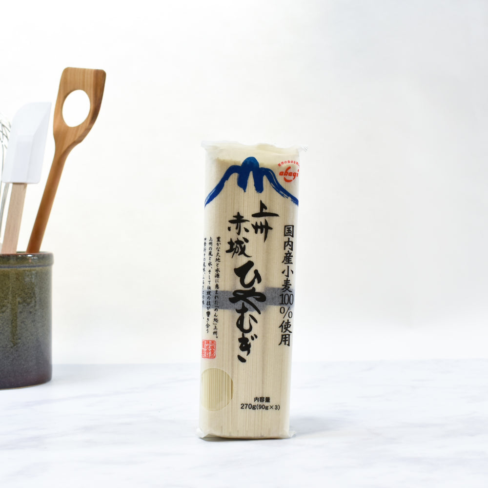 Akagi dried hiyamugi noodles are a fine Japanese wheat noodle, which sit between udon noodles and somen noodles in size. Serve the hiyamugi noodles in a similar way to somen or udon noodles.
