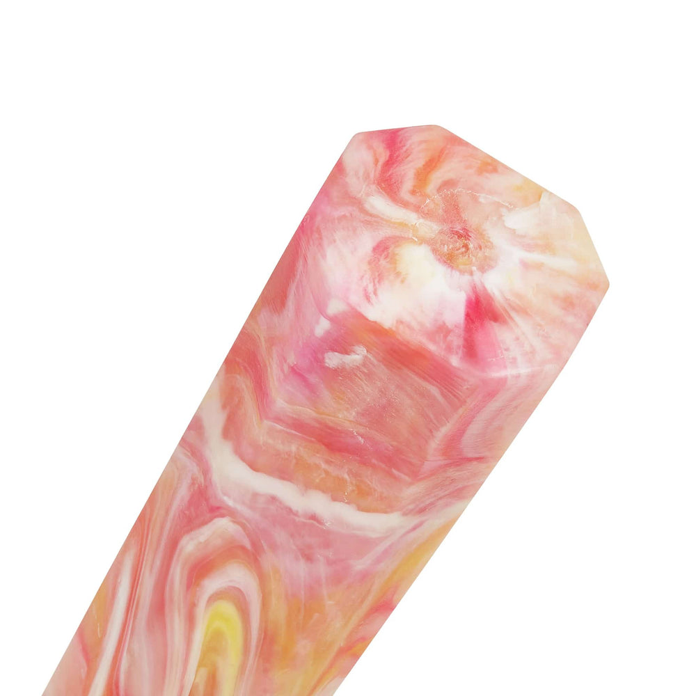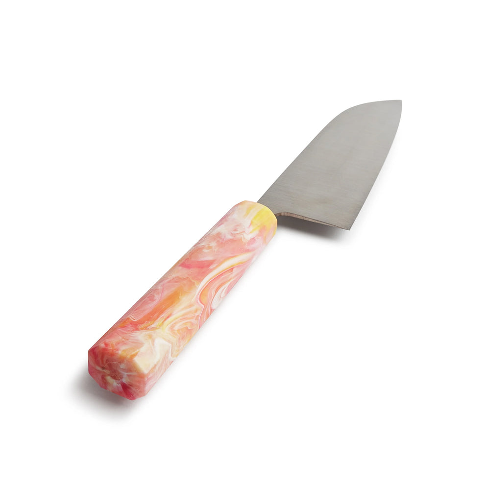The knife has an octagonal handle made from waste plastic. The plastic is washed, shredded and melted into the handle shape. The vibrant shades of pink, yellow and orange are reminiscent of fruit salad sweets. No two handles are the same, so each knife has its own unique pattern.