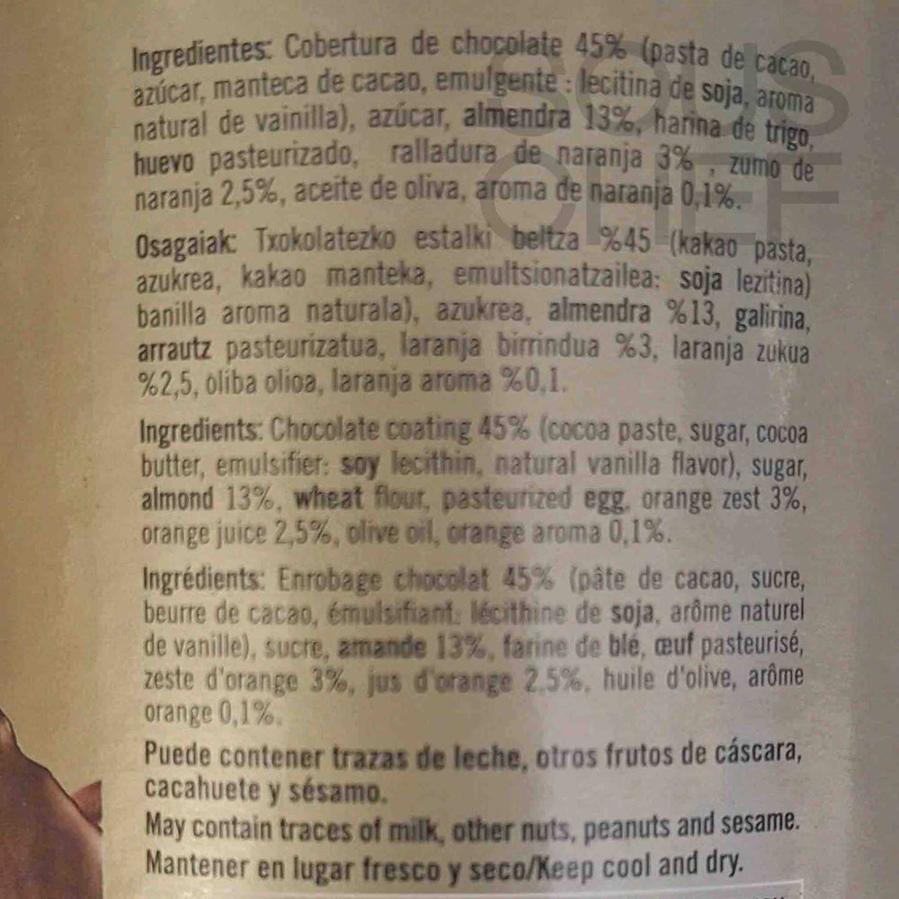 Product formulations and details may change. For the latest ingredients and allergen information always check product packaging prior to consumption. Ingredients: Chocolate coating 45% (cocoa paste, sugar, cocoa butter, emulsifier: soya lecithin, natural vanilla flavouring), sugar, almond 13%, wheat flour, pasteurised egg, orange zest 3%, orange juice 2.5%, olive oil, orange flavouring 0.1%