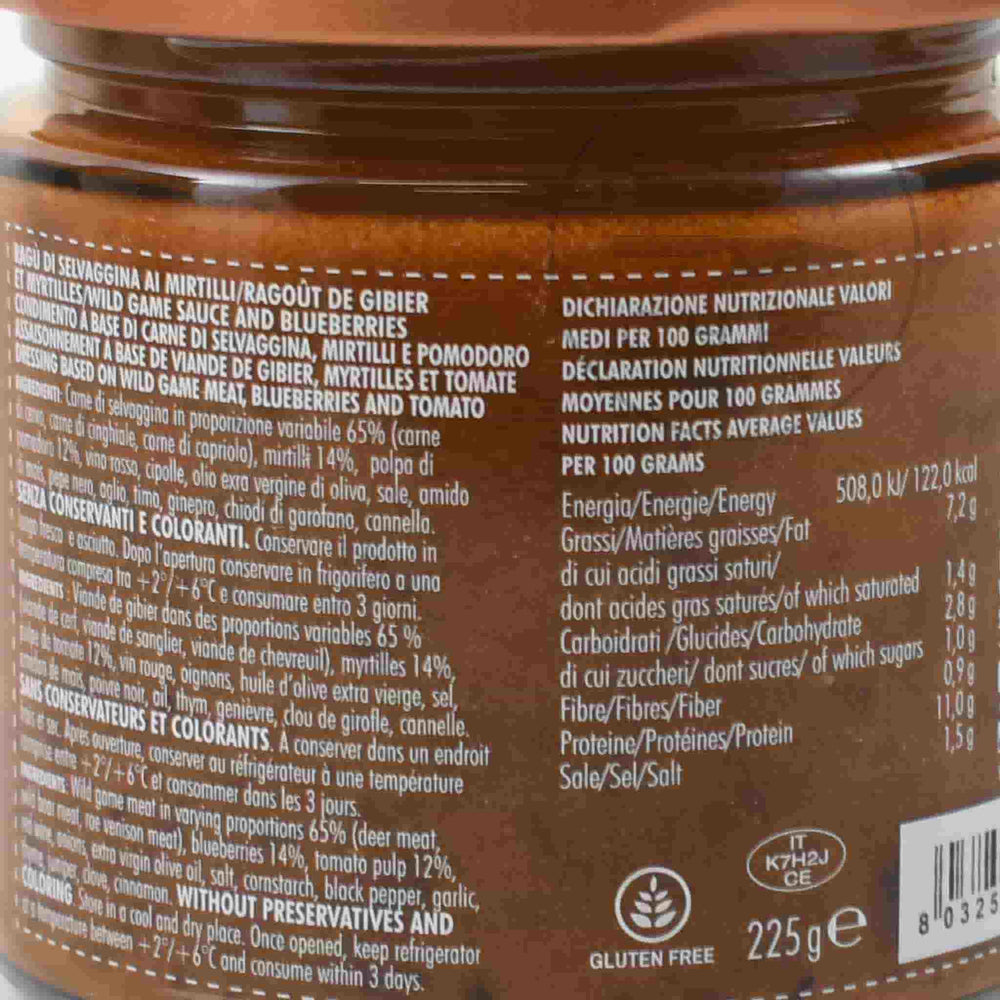 Product formulations and details may change. For the latest ingredients and allergen information always check product packaging prior to consumption. Ingredients: Wild game meat in varying proportions 65% (deer meat, wild boar meat, roe venison meat), blueberries 14%, tomato pulp 12%, red wine, onions, extra virgin olive oil, salt, cornstarch, black pepper, garlic, thyme, juniper, clove, cinnamon
