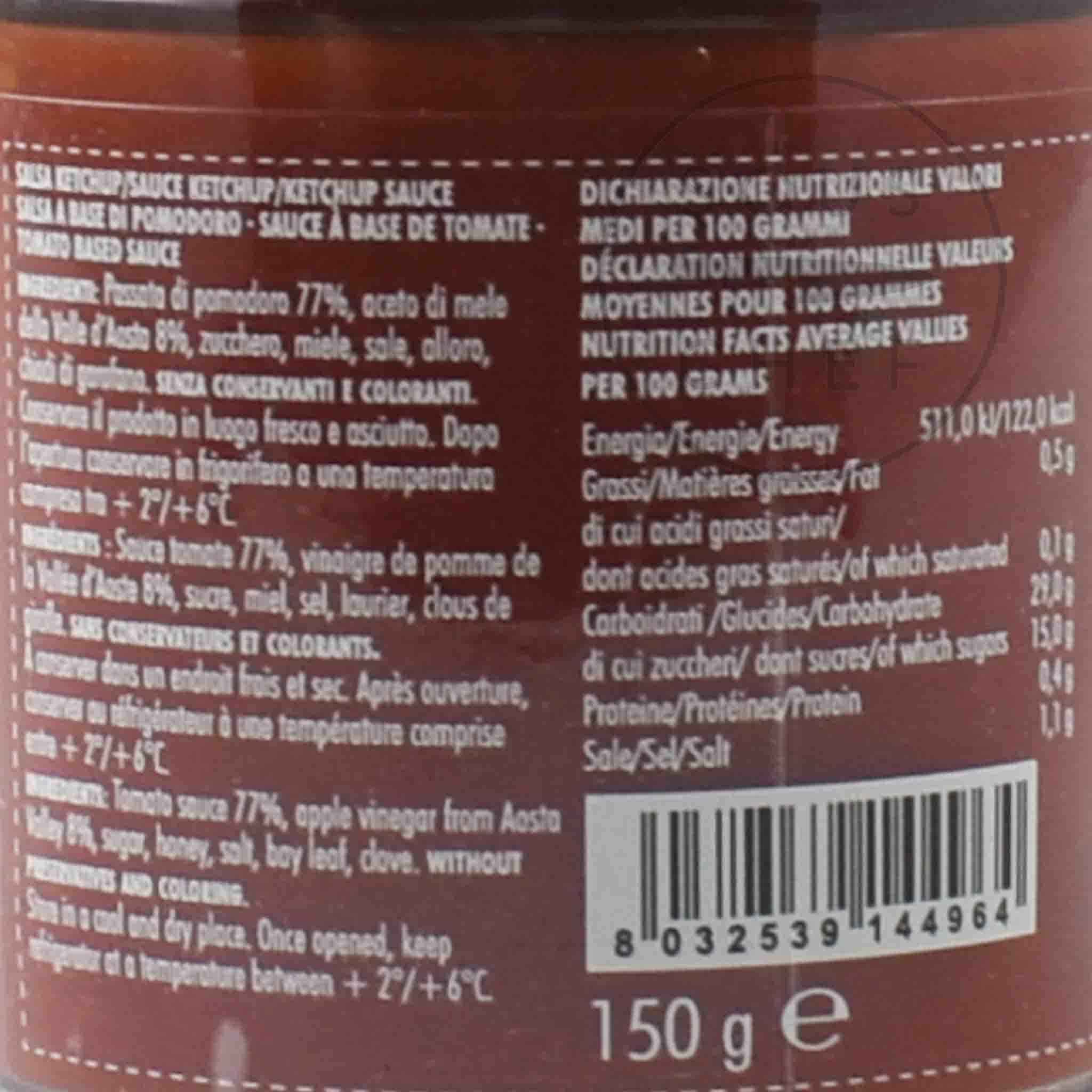 Product formulations and details may change. For the latest ingredients and allergen information always check product packaging prior to consumption. Ingredients: Tomato sauce 77%, apple vinegar from Aosta Valley 8%, sugar, honey, salt, bay leaf, clove.