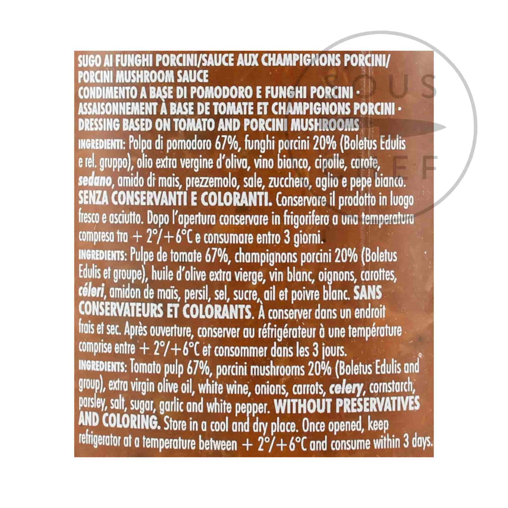 Product formulations and details may change. For the latest ingredients and allergen information always check product packaging prior to consumption. Ingredients: Tomato pulp 67%, porcini mushrooms 20% (Boletus Edulis and group), extra virgin olive oil, white wine, onions, carrots, celery, parsley, cornstarch, salt, sugar, garlic and white pepper.