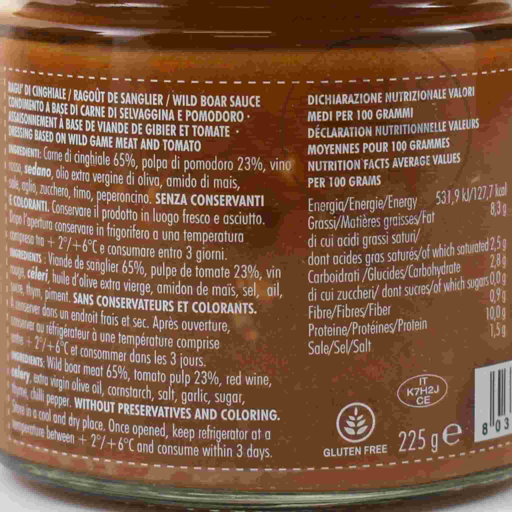Product formulations and details may change. For the latest ingredients and allergen information always check product packaging prior to consumption. Ingredients: Wild boar meat 65%, tomato pulp 23%, red wine, celery, extra virgin olive oil, cornstarch, salt, garlic, sugar, thyme, chilli pepper.