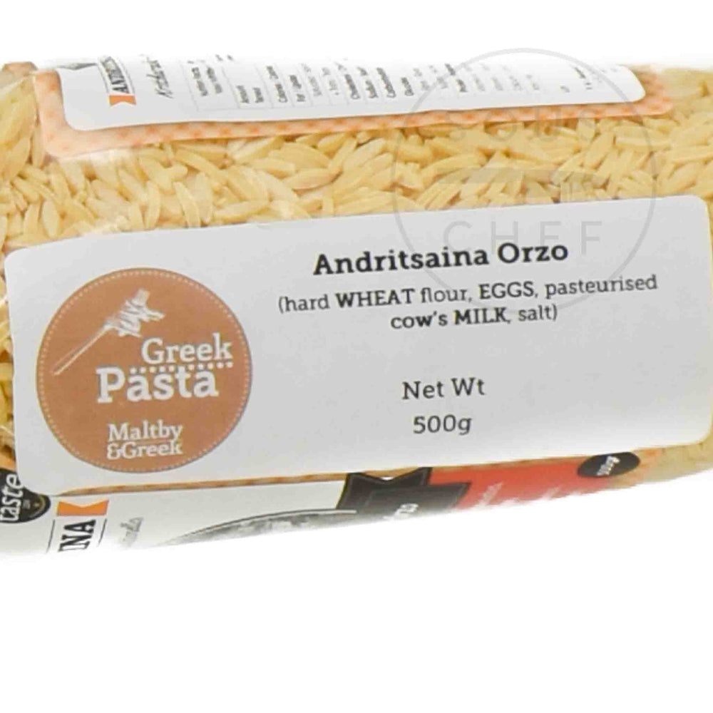 Andritsaina Kritharaki orzo is the traditional Greek grain used to make Giouvetsi – a beef stew. Made from wheat and eggs, orzo is a small, short-cut type of pasta, shaped like grains of rice. Like arborio rice, orzo is wonderful at absorbing liquid – as well as adding it to Greek casseroles, use orzo to make seafood risottos, summer salads and minestrone soups.