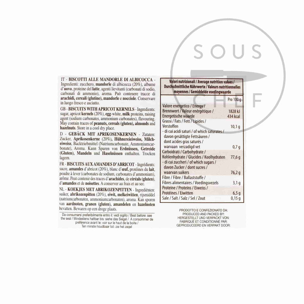 Product formulations and details may change. For the latest ingredients and allergen information always check product packaging prior to consumption. Ingredients: Sugar, apricot kernels (20%), egg-white, milk proteins, raising agent (sodium carbonates E500, ammonium carbonates E503), flavouring