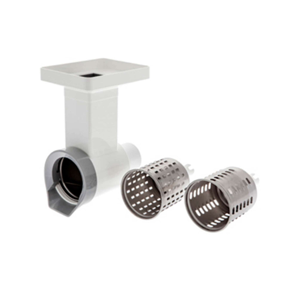 To use the attachment, you need to turn your mixer on its side. Place a plate or chopping board beneath the grater to collect your chopped vegetables. With your ingredients grated and ready to go, dinner will be ready in minutes.