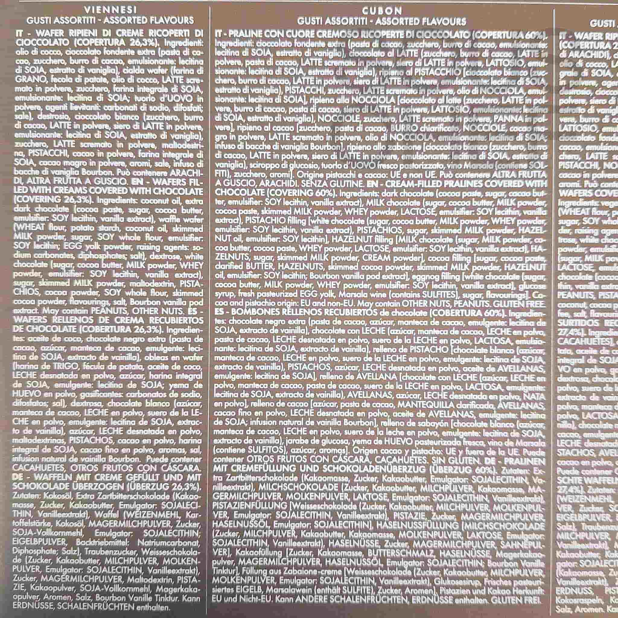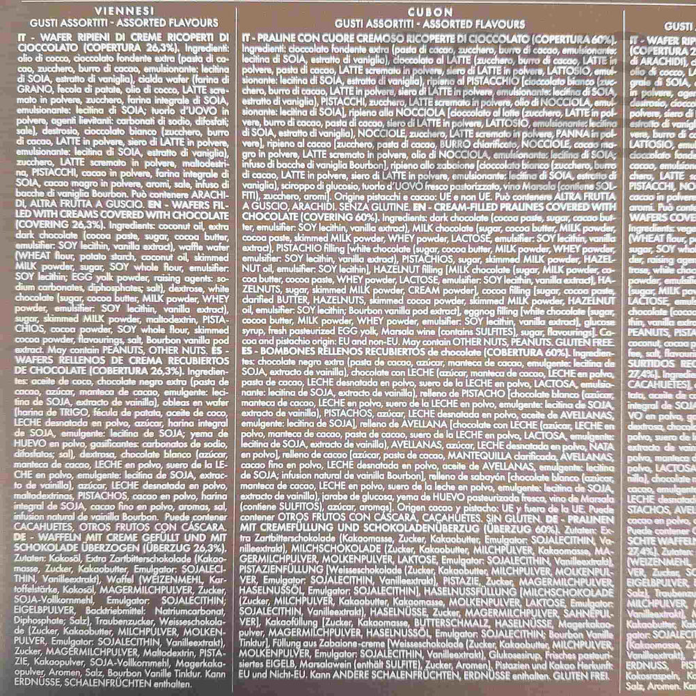cubon-ingredients: dark chocolate (cocoa paste, sugar, cacao butter, emulsifier: soy lecithin, vanilla extract), milk chocolate (sugar, cocoa butter, milk powder, cocoa paste, skimmed milk powder, whey powder, lactose, emulsifier: soy lecithin, vanilla extract), pistachio filling [white chocolate (sugar, cocoa butter, milk powder, whey powder, emulsifier: soy lecithin, vanilla extract), pistachios, sugar, skimmed milk powder, hazelnut oil, emulsifier: soy lecithin], hazelnut filling [milk chocolate (sugar, milk powder, cocoa butter, cocoa paste, whey powder, lactose, emulsifier: soy lecithin, vanilla extract), hazelnuts, sugar, skimmed milk powder, cream powder], cocoa filling [sugar, cocoa paste, clarified butter, hazelnuts, skimmed cocoa powder, skimmed milk powder, hazelnut oil, emulsifier: soy lecithin; bourbon vanilla pod extract], eggnog filling [white chocolate (sugar, cocoa butter, milk powder, whey powder, emulsifier: soy lecithin, vanilla extract), glucose syrup, fresh pasteurized egg yolk, marsala wine (contains sulfites), sugar, flavourings]. cocoa and pistachio origin: eu and non-eu. may contain other nuts, peanuts. gluten free.