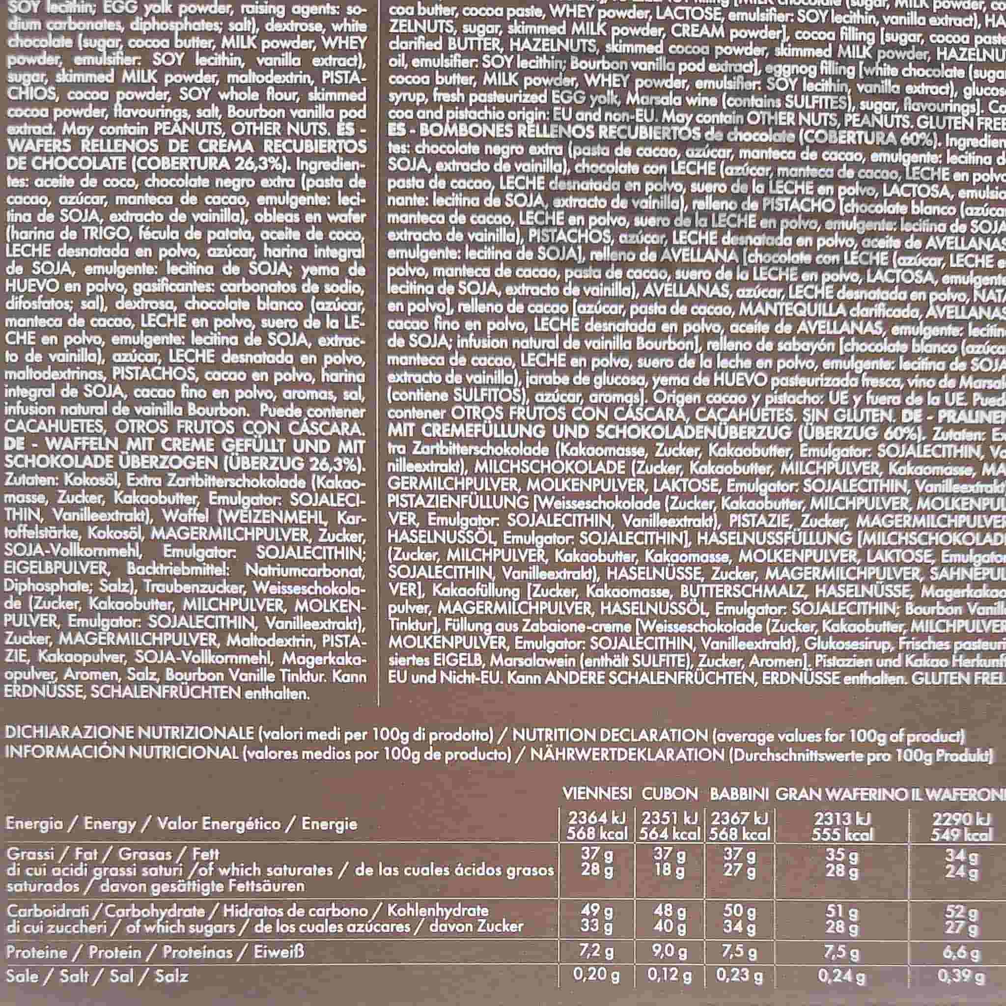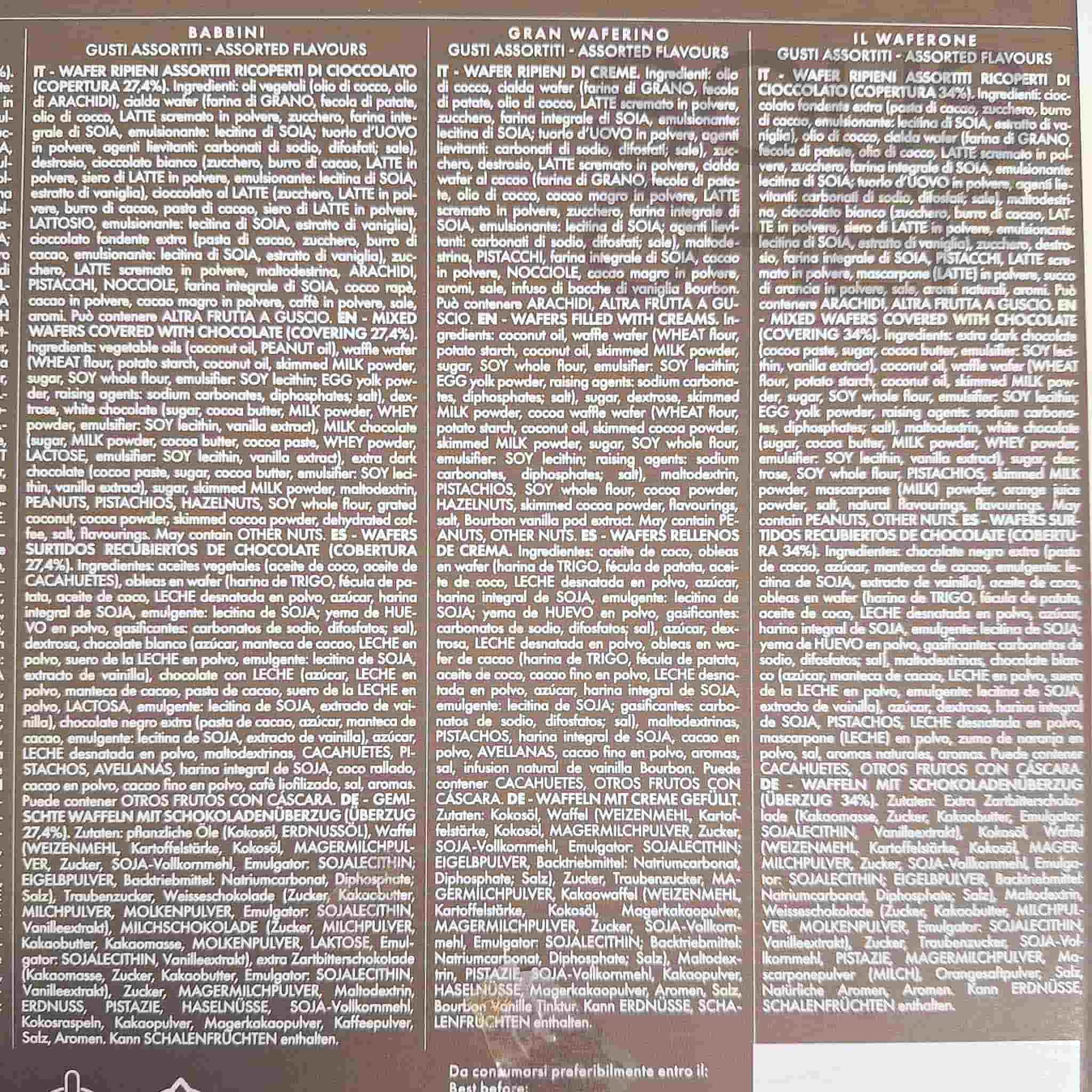 babbini-ingredients: vegetable oils (coconut oil, peanut oil), waffle wafer (wheat flour, potato starch, coconut oil, skimmed milk powder, sugar, soy whole flour, emulsifier: soy lecithin; egg yolk powder, raising agents: sodium carbonates, diphosphates; salt), dextrose, white chocolate (sugar, cocoa butter, milk powder, whey powder, emulsifier: soy lecithin, vanilla extract), milk chocolate (sugar, milk powder, cocoa butter, cocoa paste, whey powder, lactose, emulsifier: soy lecithin, vanilla extract), extra dark chocolate (cocoa paste, sugar, cocoa butter, emulsifier: soy lecithin, vanilla extract), sugar, skimmed milk powder, maltodextrin, peanuts, pistachios, hazelnuts, soy whole flour, grated coconut, cocoa powder, skimmed cocoa powder, dehydrated coffee, salt, flavourings. may contain other nuts.