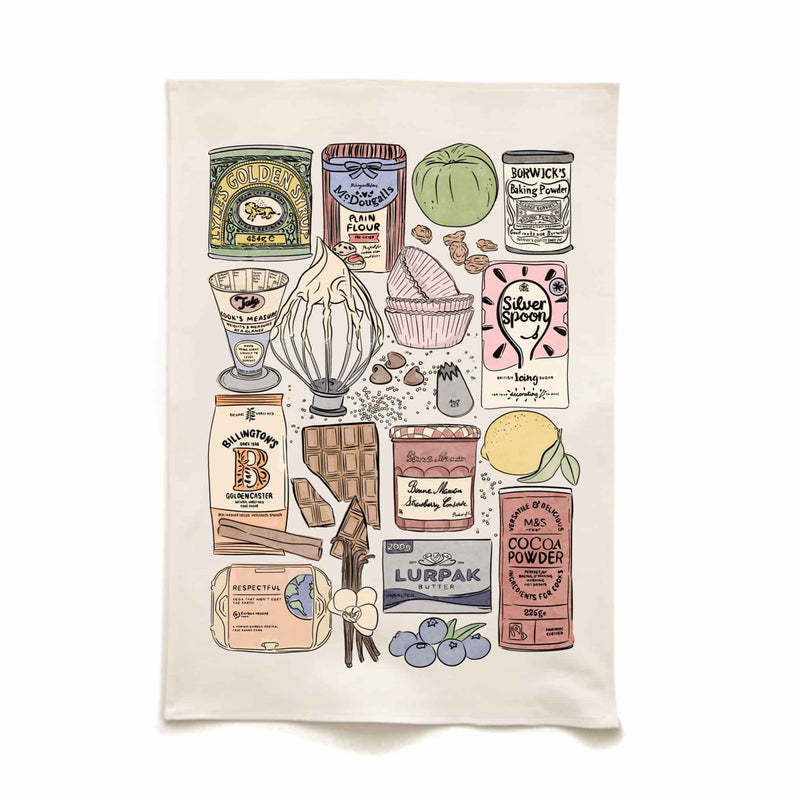 This tea towel is decorated with baking essentials. From plain flour to icing sugar, it has everything you need for home baking. The designs are hand-drawn and printed on organic cotton.