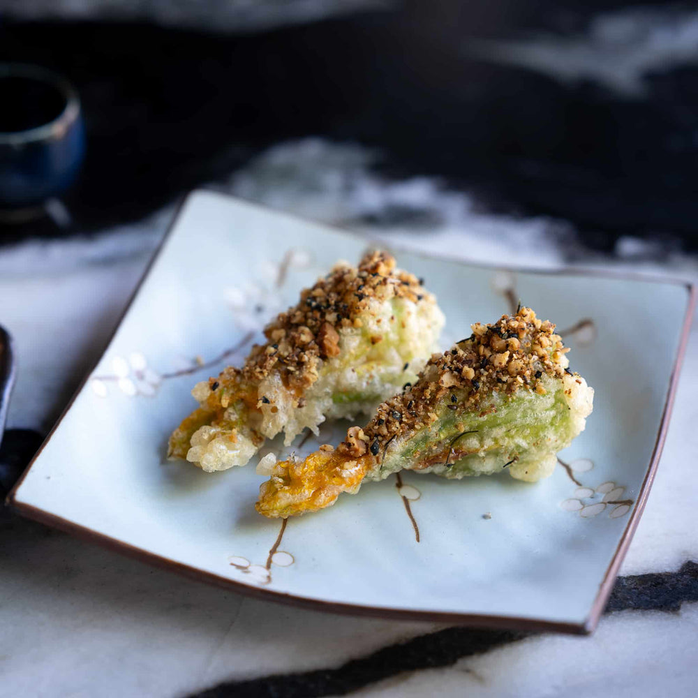 Ideal for presenting a Japanese salad, tempura, or vegetable dish.