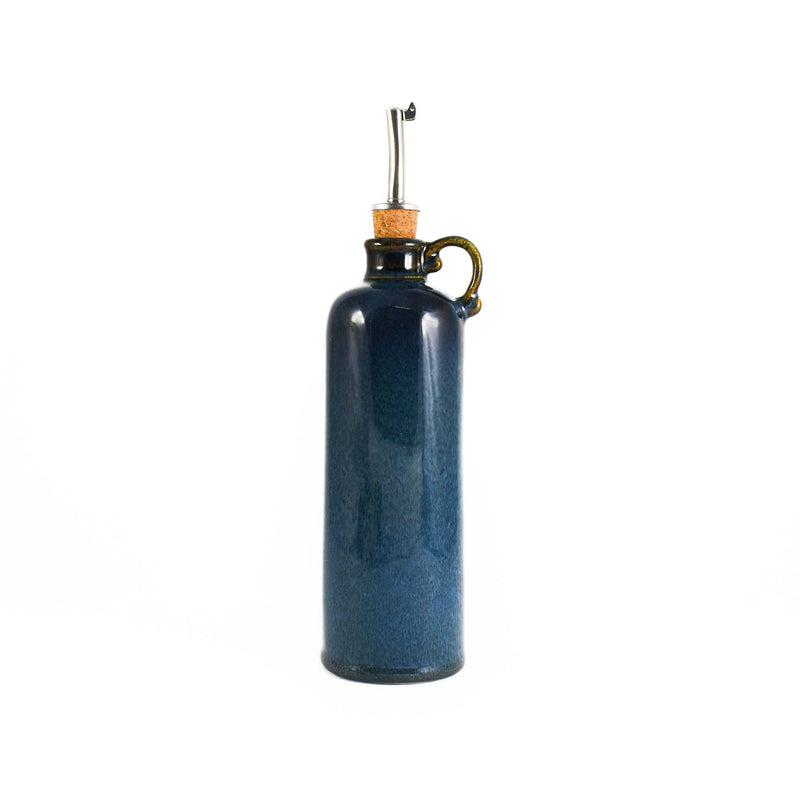 This blue glaze pouring bottle is an elegant and striking way to drizzle olive oil and vinegar over dishes. Perfect for pouring olive oil into the pan or drizzling aged balsamic on salad at the table. It includes a cork stopper and spout, to use as storage as well. This is a practical and beautiful piece that looks beautiful on any kitchen counter.