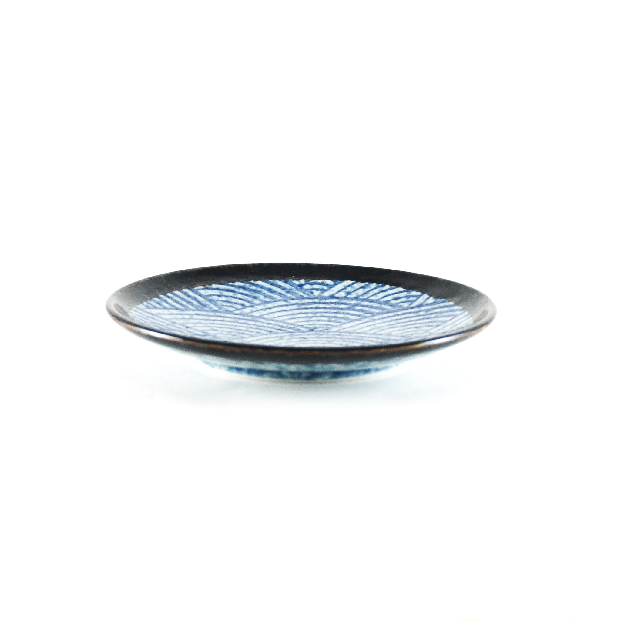 The round side plate is decorated with a textured white and blue glaze in a stylised wave pattern. The plate is finished with a glossy brown-black border.