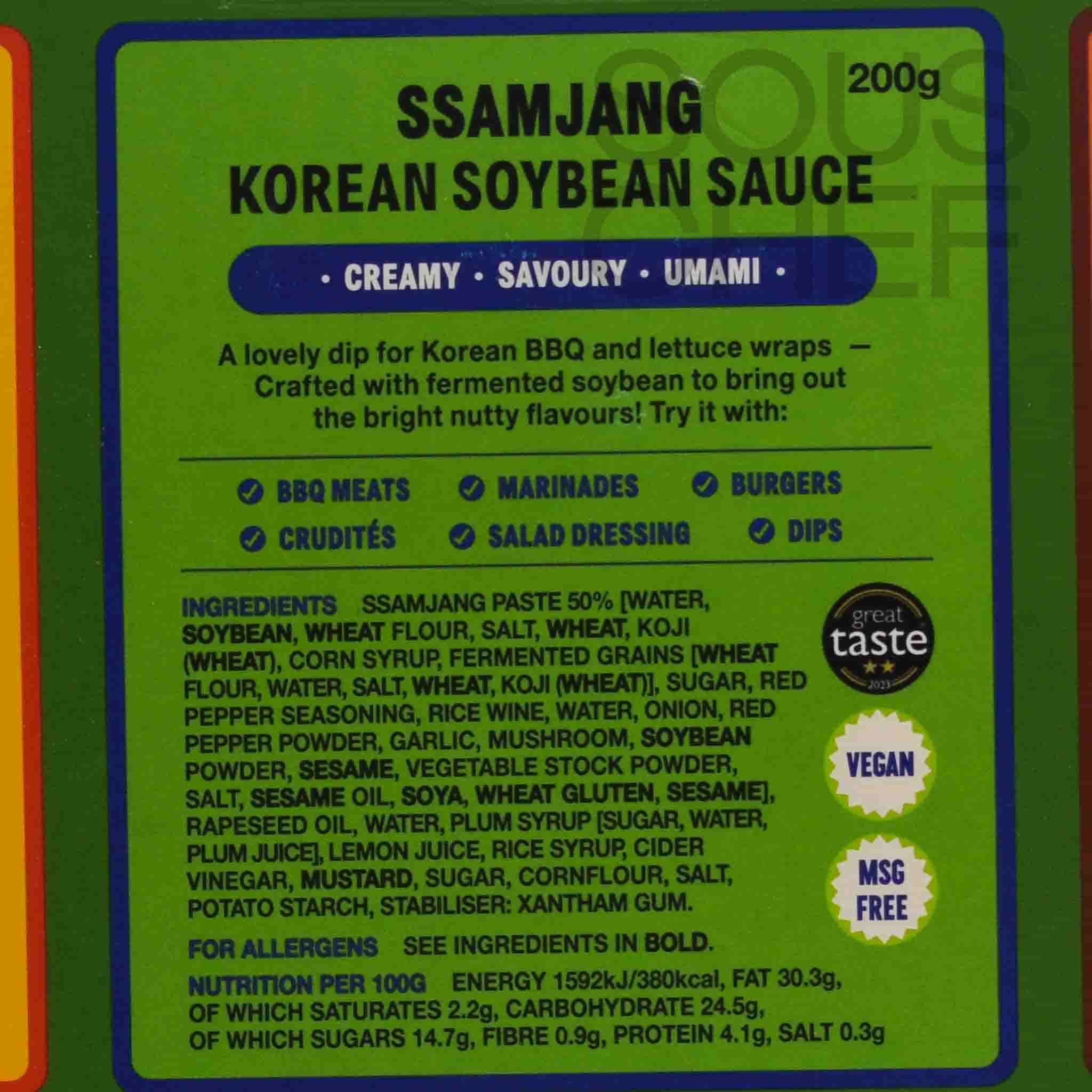Product formulations and details may change. For the latest ingredients and allergen information always check product packaging prior to consumption. Ingredients: Ssamjang: Soybean paste (soybean, wheat, salt, koji, water, alcohol), rapeseed oil, water, sugar, green plum syrup (green plum extract, sugar), fructooligosaccaride, vinegar, lemon concentrate, garlic concentrate, chili powder, onion, modified starch, mustard powder, salt, xanthan gum. Gochujang: Gochuajng (wheat, water, chili powder, salt, chili seasoning, rice, alcohol, koji), fructooligosaccaride, green plum syrup (green plum extract, sugar), water, hydrolyzed soy protein (soybean), garlic, garlic concentrate, ginger, paprika extract. Kimchi Mayo: rapeseed oil, water, sugar, vinegar, green plum syrup (green plum extract, sugar), garlic, salt (sea water, sea salt), lemon concentrate, modified starch, mustard powder, garlic concentrate, xanthan gum, toasted onion powder, chili powder, sesame seed oil, paprika extract.