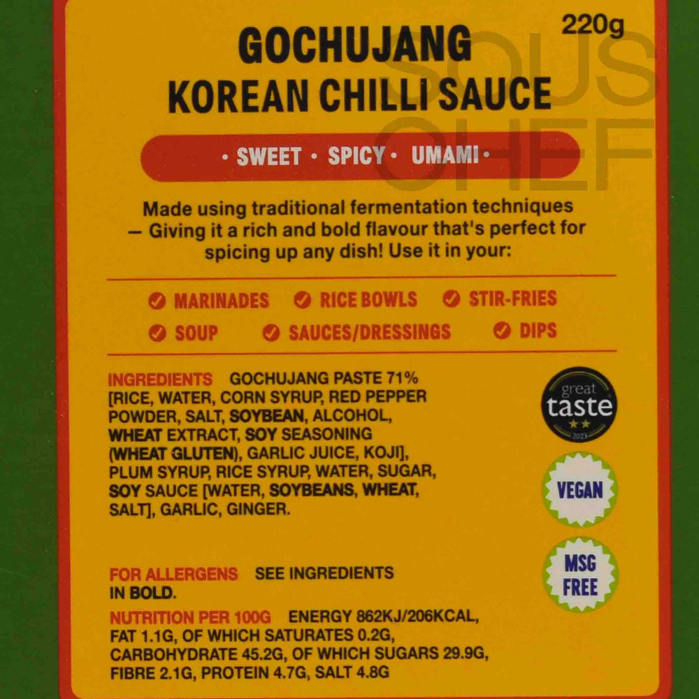- Gochujang: Korean chilli sauce with a sweet-spicy flavour. Rich in umami, it’s a great base for stews and marinades.