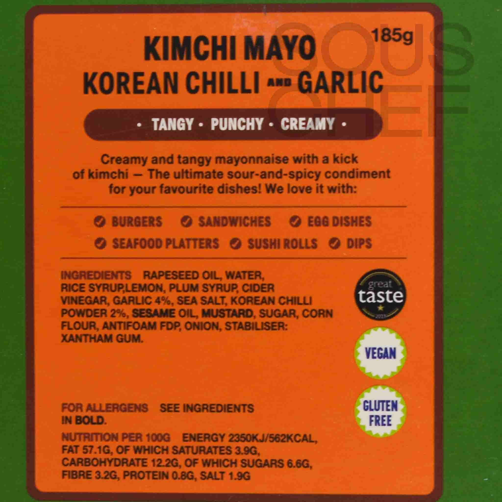 - Kimchi Mayo: Your new favourite condiment for French fries, hot dogs and rice bowls. Kimchi gives creamy vegan mayo a zingy flavour and subtle heat.