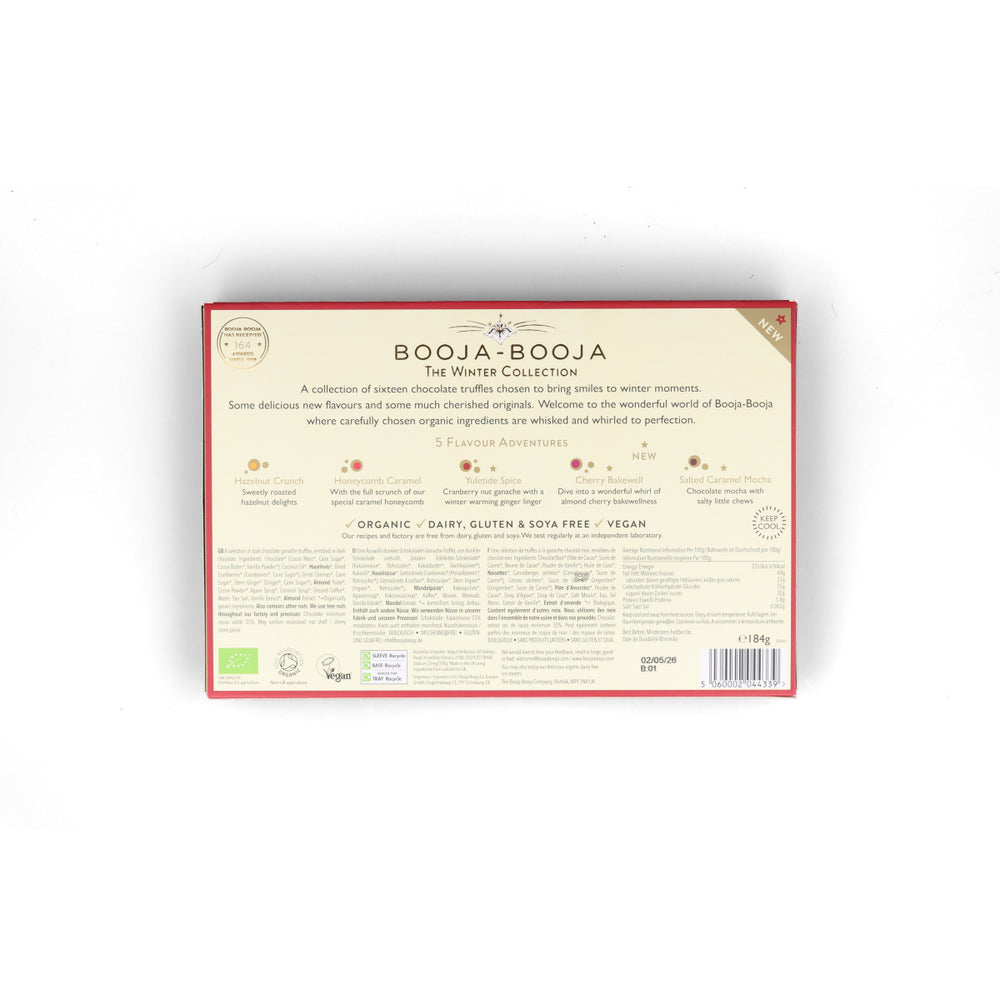 Satisfy your sweet tooth with Booja Booja’s Winter Truffle selection. The elegant box contains 16 vegan truffles in five delicious flavours. Dusted with cocoa powder, they have a silky smooth ganache centre.