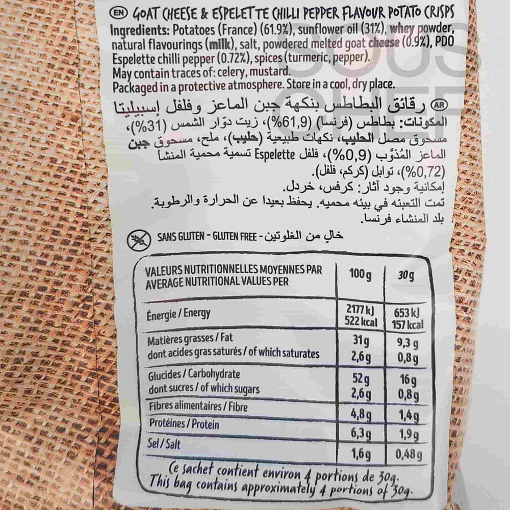 Product formulations and details may change. For the latest ingredients and allergen information always check product packaging prior to consumption. Ingredients: Potatoes (France), sunflower oil , whey powder, natural flavourings (milk), salt, powdered melted goats cheese, pdo espelette chilli pepper, spices (turmeric, pepper).
