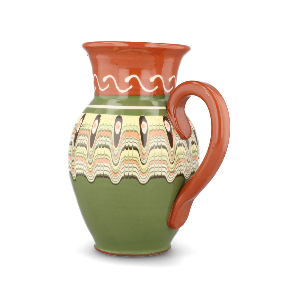 This pitcher is part of a collection of Bulgarian pottery. It’s produced in the city of Troyan, which is famous for its ceramics. The vibrant colours and unique designs are an eye-catching alternative to traditional tableware.