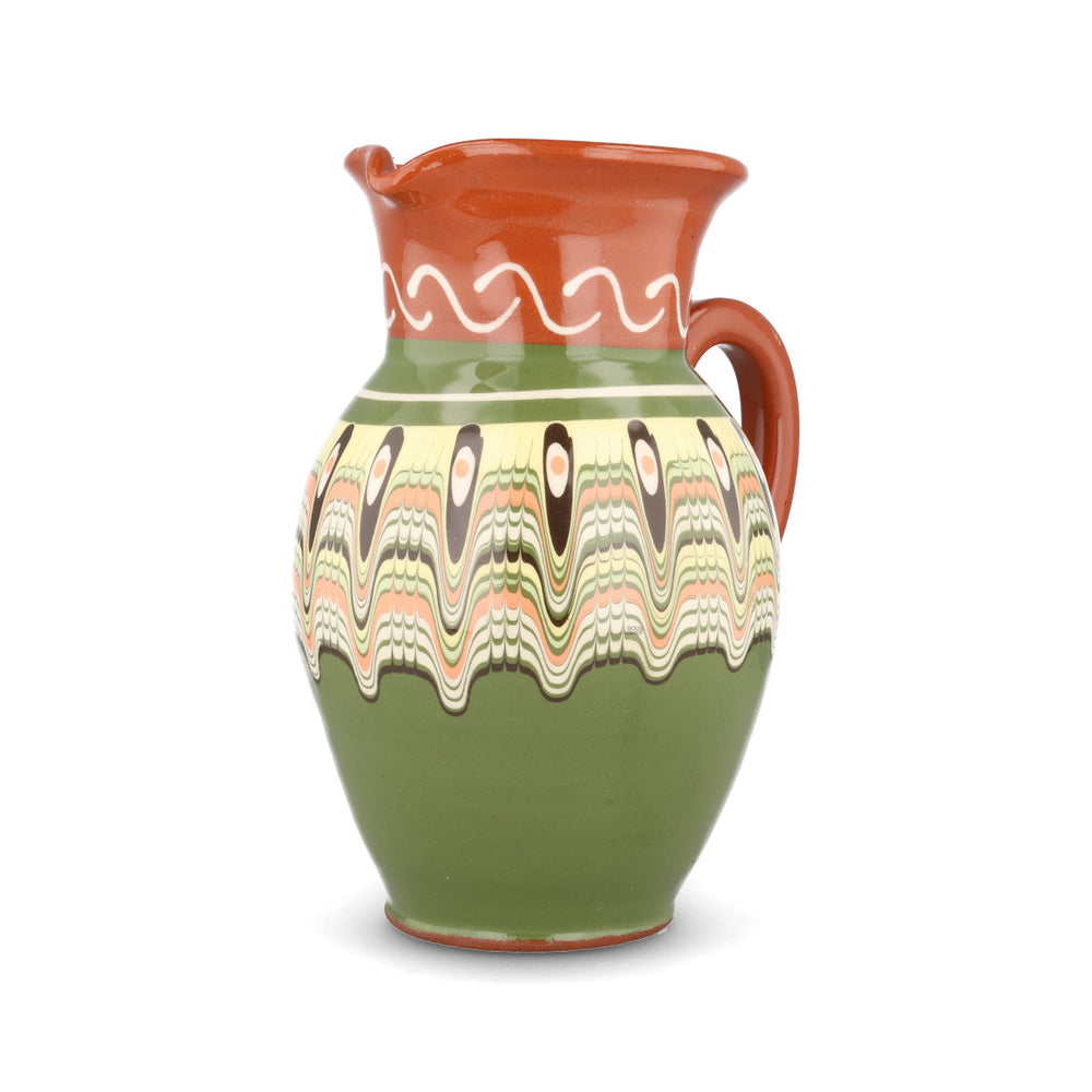 The handmade pitcher has a rounded body and narrow base. The exterior is decorated with a colourful wave pattern.