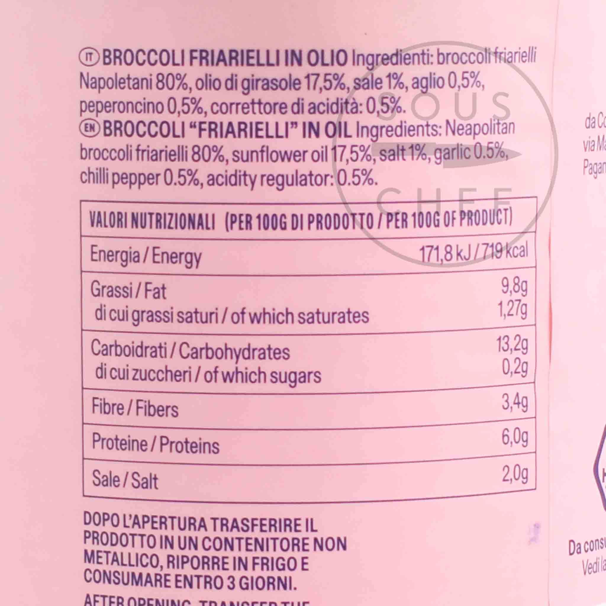 Product formulations and details may change. For the latest ingredients and allergen information always check product packaging prior to consumption. Ingredients: “Friarielli” broccoli, sunflower oil, salt, garlic, hot pepper, acidity regulator: citric acid.