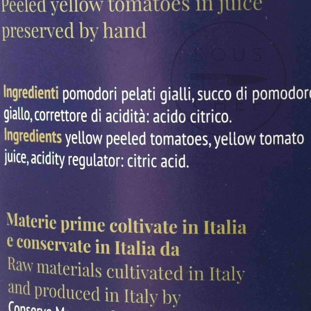 Product formulations and details may change. For the latest ingredients and allergen information always check product packaging prior to consumption. Ingredients: Yellow peeled tomatoes, yellow tomato juice, acidity regulator: citric acid.