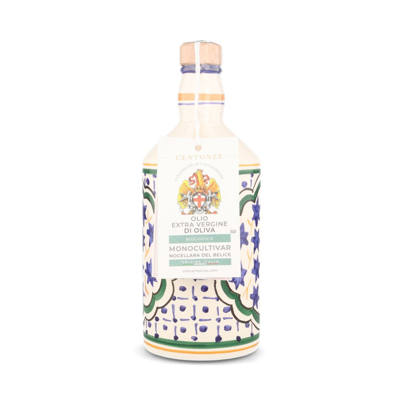 The bottle is inspired by Sicilian ceramics. During the Baroque era, the city of Caltagirone became famous for its majolica. The potters decorated the ceramics with floral and geometric motifs. These designs are replicated on Centonze’s beautiful oil bottles.