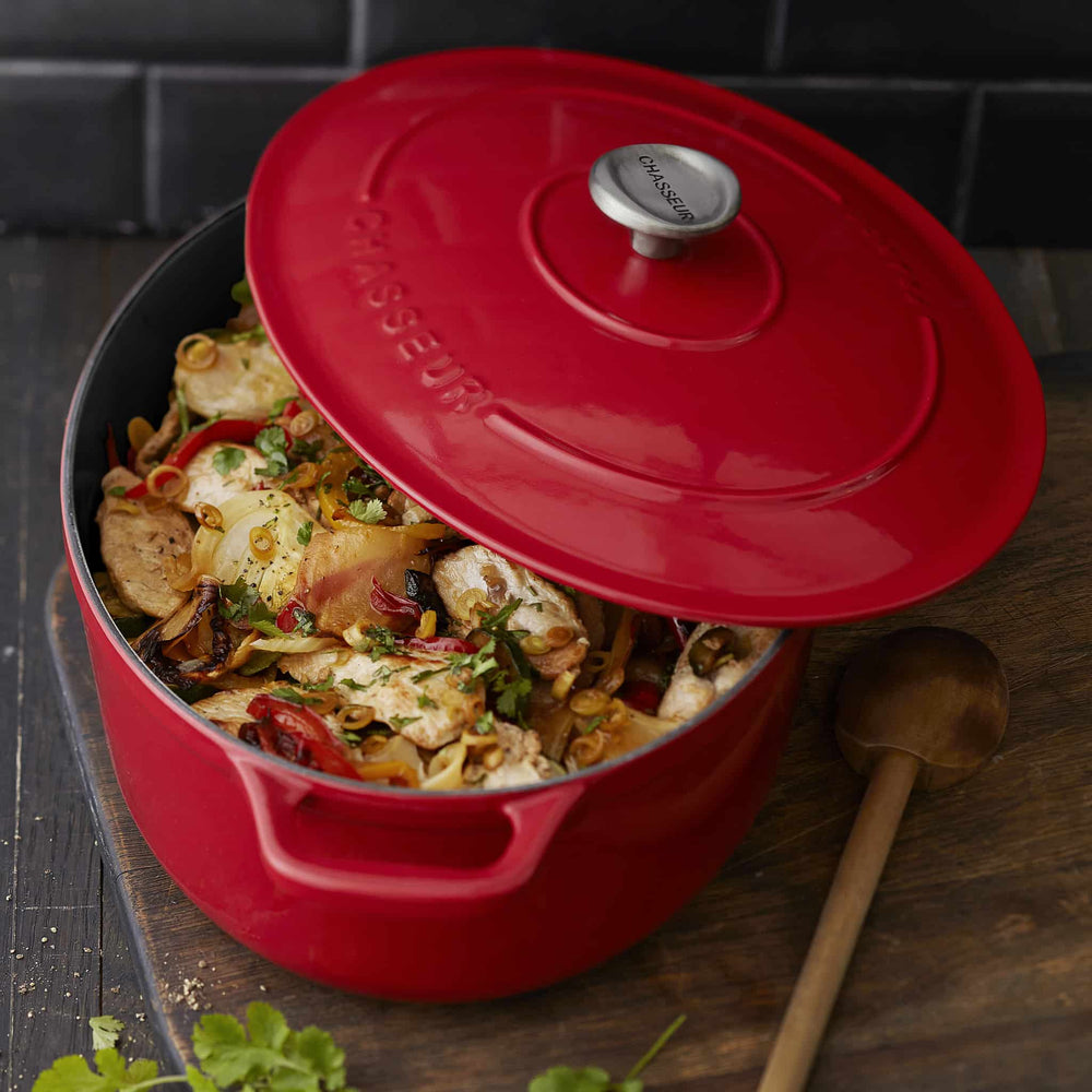 Cook soups and stews in the Chasseur red oval Dutch oven. It’s made from enamel-coated cast iron and has a 4.5 litre capacity. It’s perfect for large batches of chickpea curry or pork pibil.
