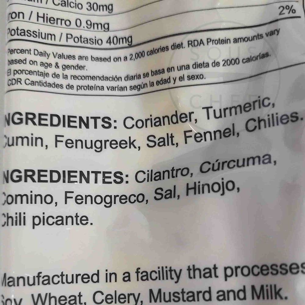 Product formulations and details may change. For the latest ingredients and allergen information always check product packaging prior to consumption. Ingredients: Coriander, Turmeric, Cumin, Fenugreek, Salt, Fennel, Chilies-