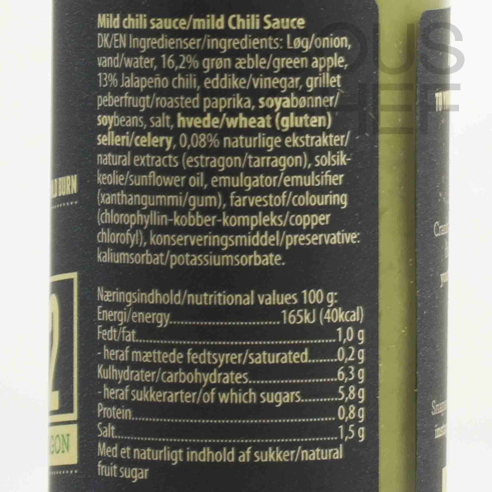 Product formulations and details may change. For the latest ingredients and allergen information always check product packaging prior to consumption. Ingredients: Onions, water, 16.2% green apple, 13% jalapeño chili, vinegar, grilled bell pepper, soybeans, salt, wheat (gluten), celery, 0.08% natural extracts (tarragon), sunflower oil, emulsifier (xanthan gum), color (chlorophyllin copper complex), preservative: potassium sorbate.
