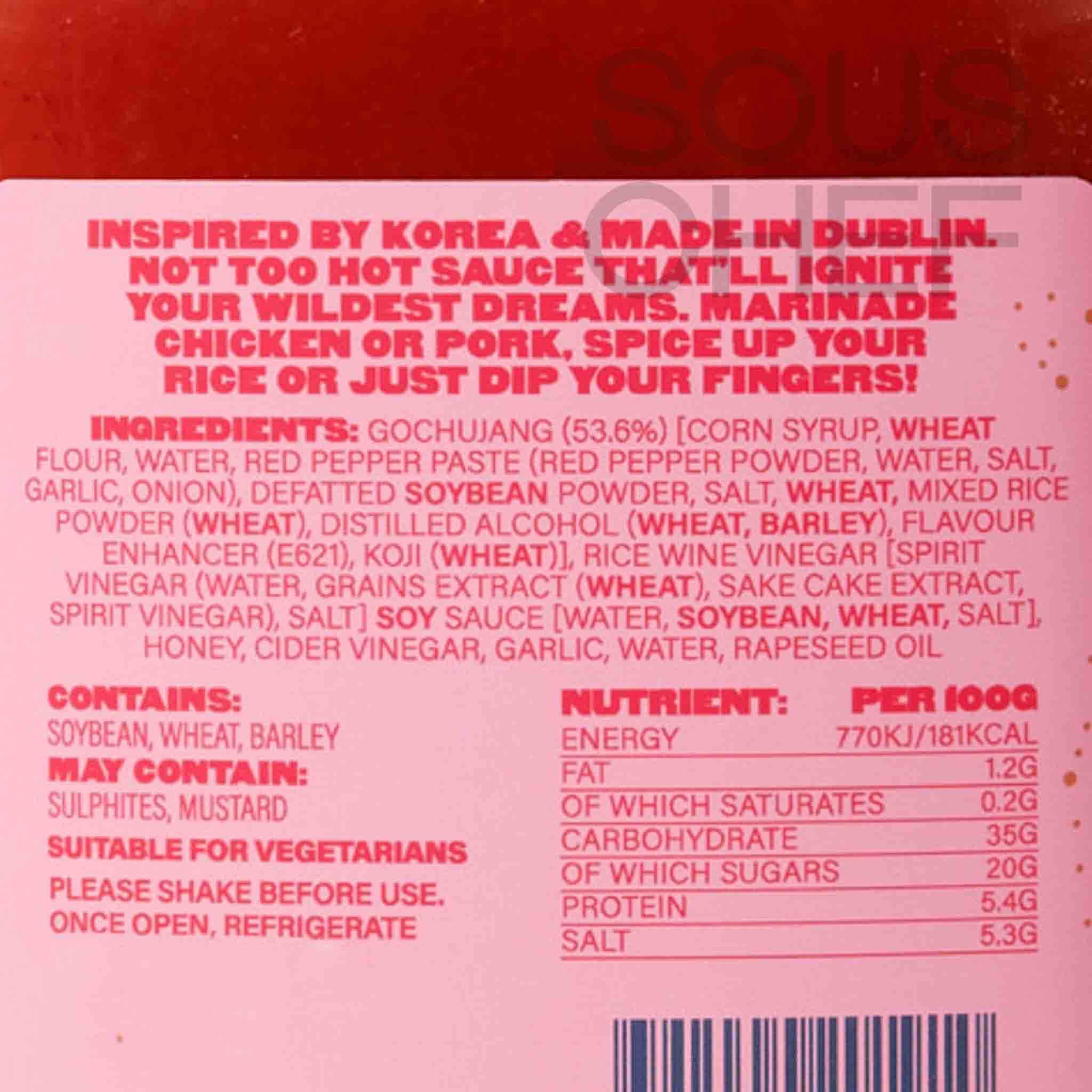 Product formulations and details may change. For the latest ingredients and allergen information always check product packaging prior to consumption. Ingredients: Gochujang (53.6%) [corn syrup, wheat flour, water, red pepper paste (red pepper powder, water, salt, garlic, onion), defatted soybean powder, salt, wheat, mixed rice powder (wheat), distilled alcohol (wheat, barley), flavour enhancer (e621), koji], rice wine vinegar [spirit vinegar (water, grains extract (wheat), sake cake extract, spirit vinegar), salt], soy sauce [water, soybean, wheat, salt] syrup, cider vinegar, garlic, water, rapeseed oil.