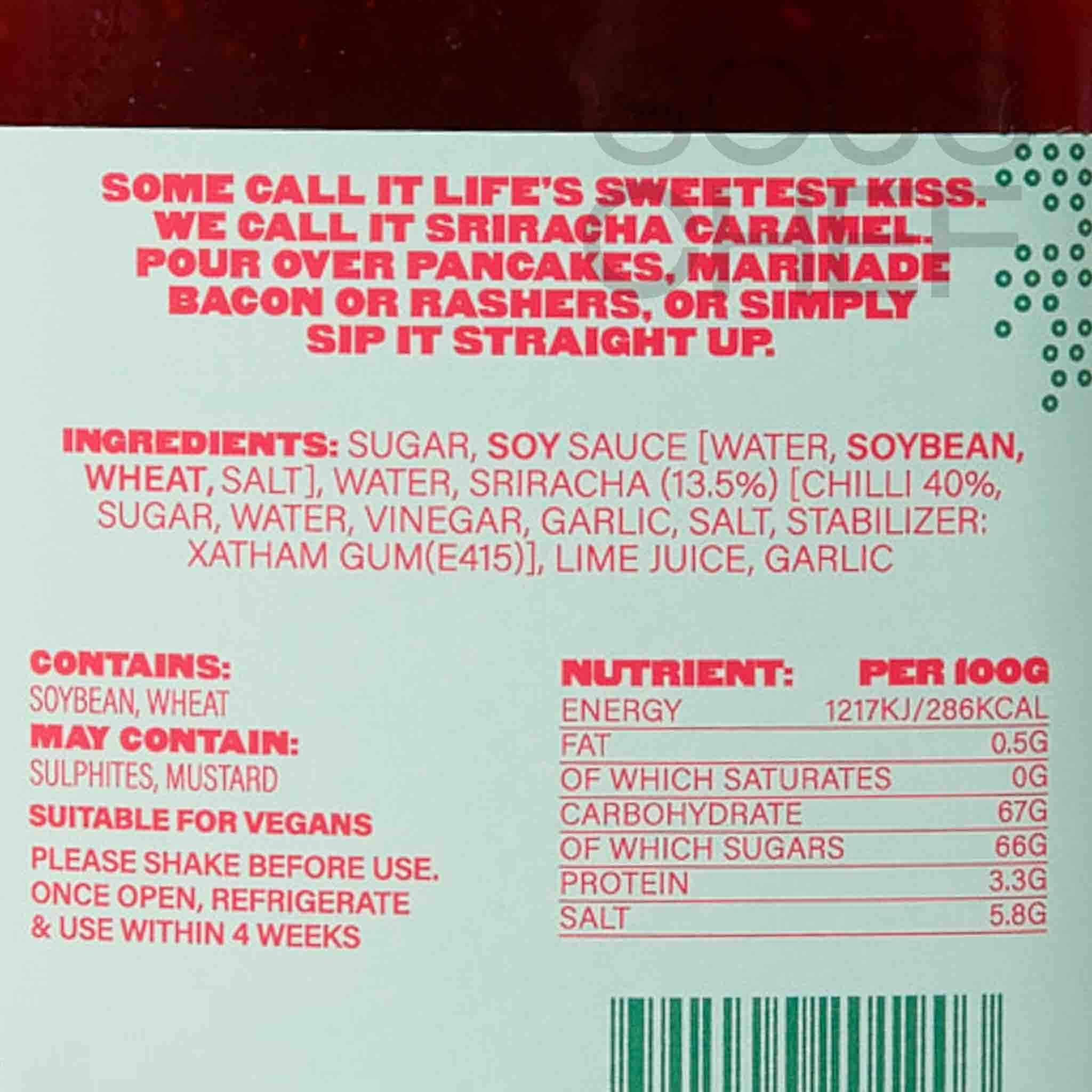 Product formulations and details may change. For the latest ingredients and allergen information always check product packaging prior to consumption. Ingredients: Sugar, soy sauce [water, soybean, wheat, salt], water, sriracha (13.5%) [hot chilli sauce [chilli 40%, sugar, water, vinegar, garlic, salt, stabilizer: xanthan gum (e415)], lime juice, garlic.