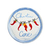 Serve a homemade pizza on the Chistu Core pizza plate. It’s decorated with a blue border and a string of red chillies. Their vibrant hue pops against the white background, adding Mediterranean style to your table.