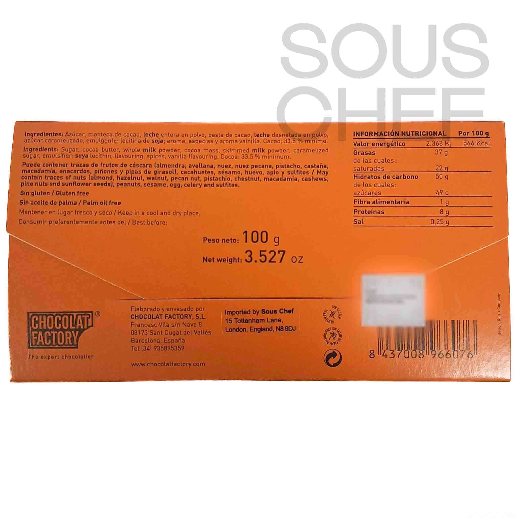 This milk chocolate bar with caramel is made by Spanish chocolate experts, Chocolat Factory. The creamy chocolate melts on your tongue, giving way to the sweetness of caramel.