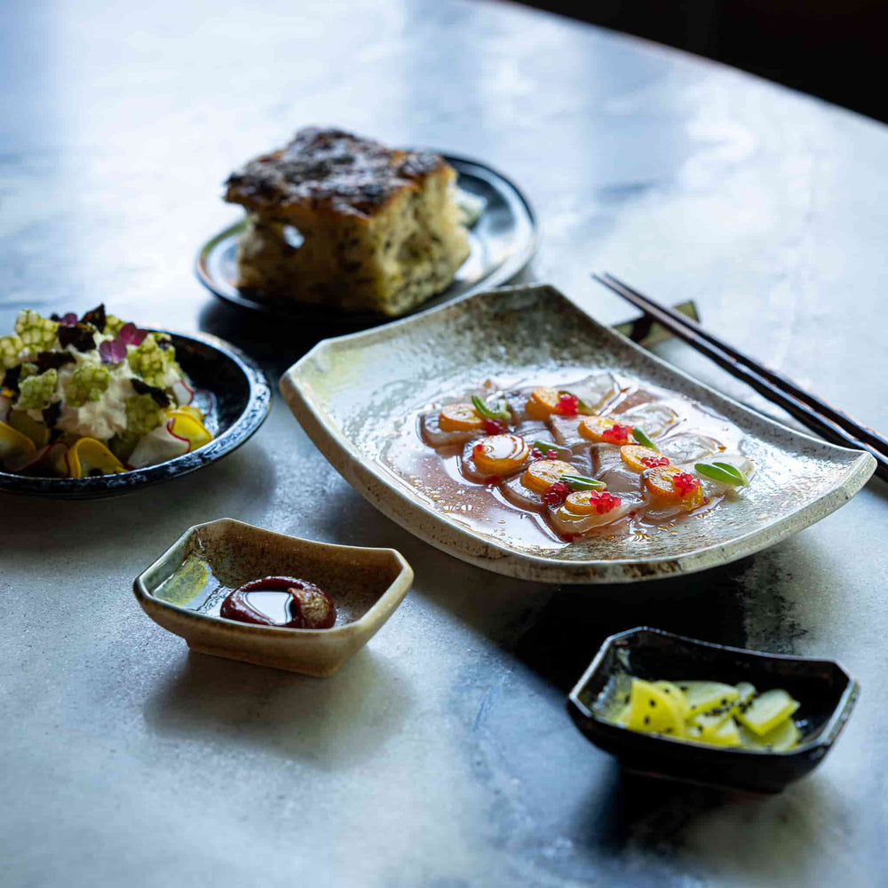 "Chouseki" means tide in Japanese reflecting this sauce dish's stunning pattern - sea blue glaze merges with a speckled sandy gold glaze like waves on the shore.